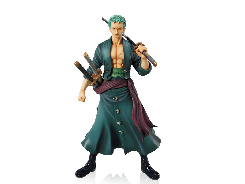 整體采用環保樹脂材質,紅綠黑三種配色過渡勻稱,服裝干凈整潔,手上和腰間分別佩戴三刀流佩劍,腳穿黑色戰靴,戰斗道具還原標準戰斗細節,制作細膩逼真、高仿真姿態,體態形狀高度仿真動漫原作。